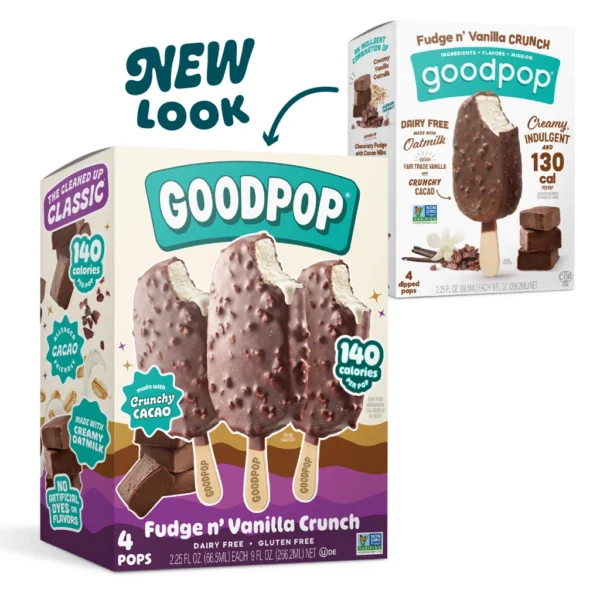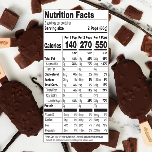 Frozen dessert: oatmilk (water, gluten free oats*), fair trade cane sugar*, coconut oil*, pea protein*, sunflower oil*, fair trade vanilla extract*, guar gum*, sea salt, sunflower lecithin*, natural flavors*. Fudge coating: chocolate, cane sugar*, coconut oil, cacao nibs*, sunflower lecithin, natural flavor.