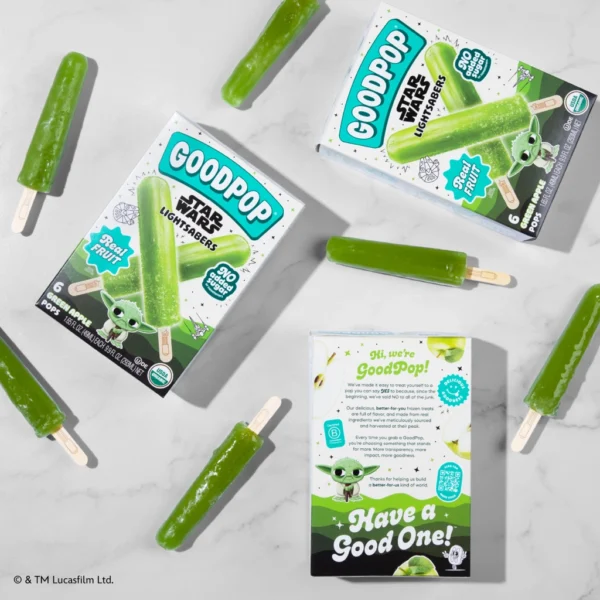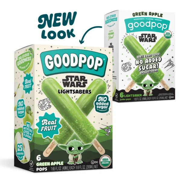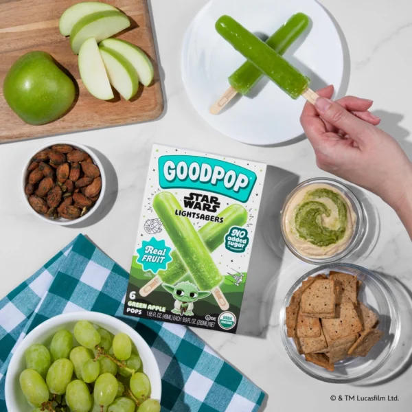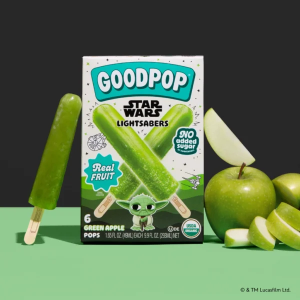 Create your own adventure as you wield Star Wars Organic Green Apple Lightsabers from GoodPop. Protecting the galaxy has never been tastier with 100% fruit juice ice pops by your side. No added sugar or artificial dyes and sweeteners make for a lightly tart and fully flavorful apple-snacking experience. A genuinely GOOD treat to share with your young Padawan.